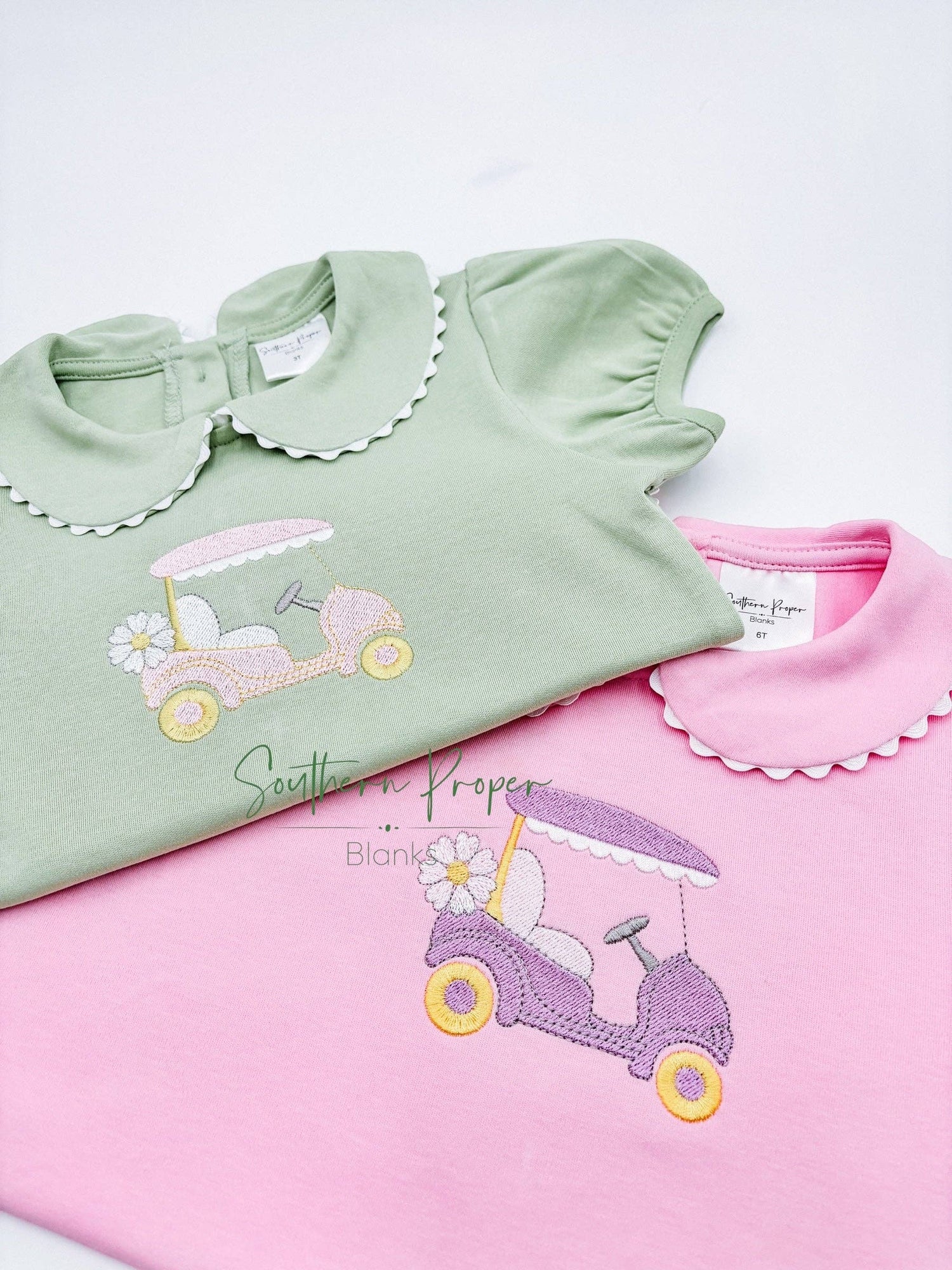 Who doesn’t love a scalloped edge?! Our scalloped collared shirts are no different! Available in LONG sleeve and SHORT sleeve. I decided to change up material to combed cotton for an easy stitch out for embroidery.
